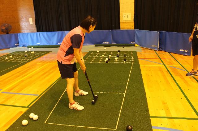 また、囲碁ボールはゲートボールのようなスティックで7×7の49個のホールへ向けて交互にボールを打っていく種目です。