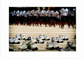 運動場に靴を並べる場所があり、そこでなぜか一足だけすごくきれいに並べられていたので、それが面白くて撮りました。