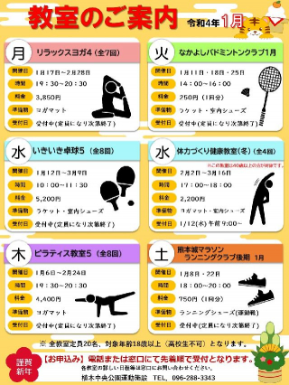 植木中央公園運動施設では、引き続きお客様が安心して教室に参加していただけるよう新型コロナ感染拡大防止対策として消毒・検温に努めてまいります。皆様のご参加を心よりお待ちしております。