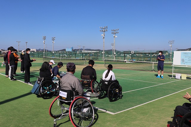 テニスコートで行われた車いすテニス体験会では、健常者の方が実際に競技用車いすに乗っていただき車いすの動かし方、ラケットの振り方を体験していただきました。「テレビでは簡単に操作されているのに車いすの操作がこんなに難しいとは、いい経験ができ楽しかった」「車いすテニスのルールが分かり、プレーするのがこんなに大変だと思わなかった」と感想を頂きました。後半は車いすテニス現役選手の方とも試合をしたりと交流を深め楽しまれていました。