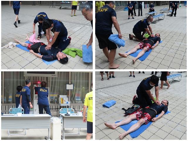 プールサイドでは他のスタッフが心肺蘇生法を行います。