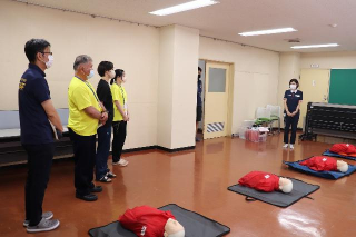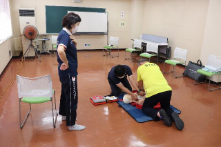 救急法訓練では、心臓マッサージの方法やAED(自動体外式除細動器)を用いた電気ショックなどを習得しました。
