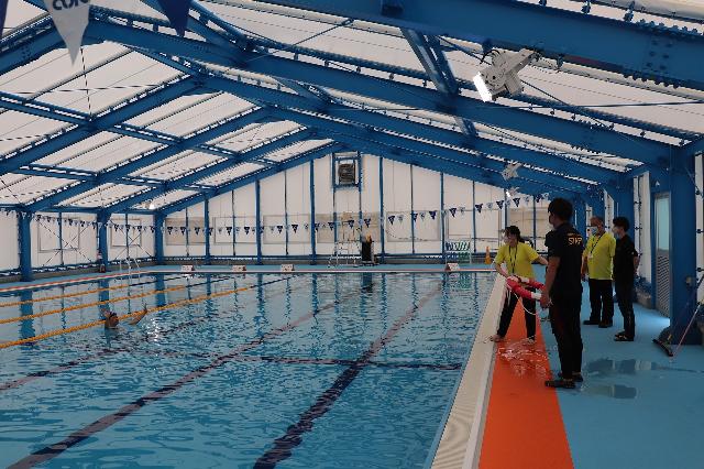 水難救助訓練では、男性が溺れているという想定の下、プールサイドへの上げ方や119番通報、AEDの依頼など、連携の取り方を訓練しました。