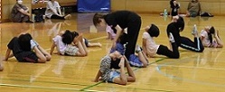 新体操の基本である柔軟体操、みんな頑張りました。