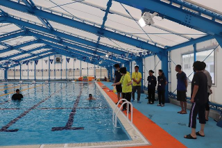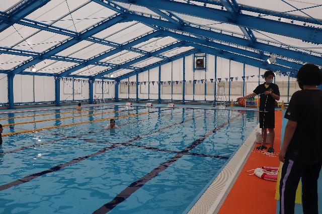 水難救助訓練では、男性が溺れているという想定の下、プールサイドへの上げ方や119番通報、AEDの依頼など、連携の取り方を訓練しました。