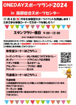 【11月4日(月)】ONEDAYスポーツランド2024 in 南部総合スポーツセンター開催します!
