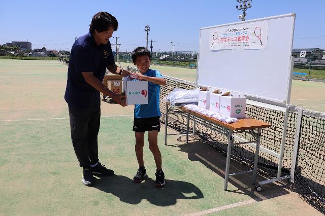 練習後のお楽しみ抽選会では、JA鹿本農業協同組合植木支所様より「スイカ」、バボラVSジャパン株式会社様から「バッグ」「靴下」をご提供いただき、豪華景品の抽選会となりました。