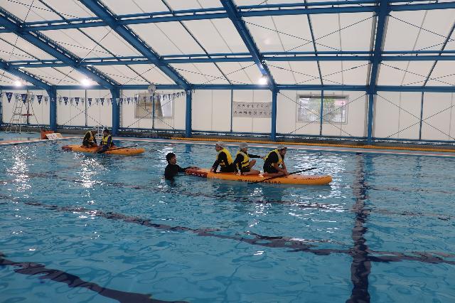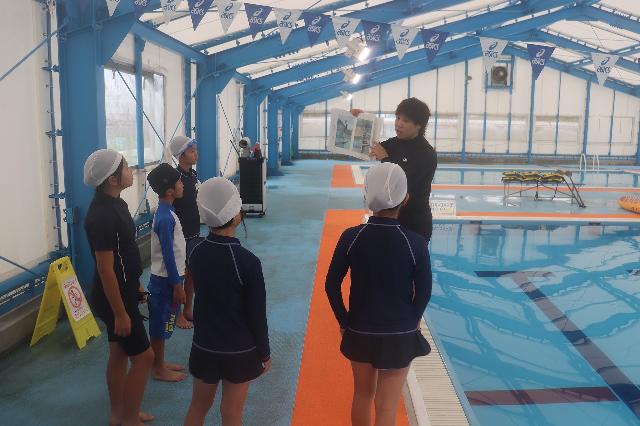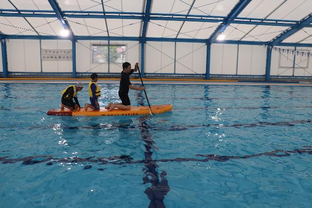 初めに、紙芝居によるSUPの説明やライフジャケットを着用しての背浮きなどを学びました。