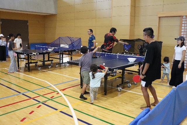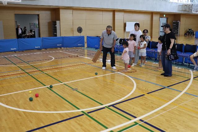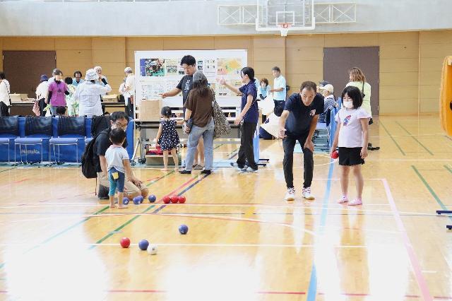 体育館で「卓球マシーンチャレンジ」「ペタンク体験」「ボッチャ体験」、